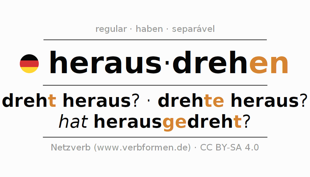 O prefixo heraus - de herausdrehen é separável. A flexão ocorre em Ativo e é usada como Oração interrogativa. Para melhor compreensão estão disponíveis incontáveis. Exemplos do verbo herausdrehen . Para a prática e consolidação do estudo