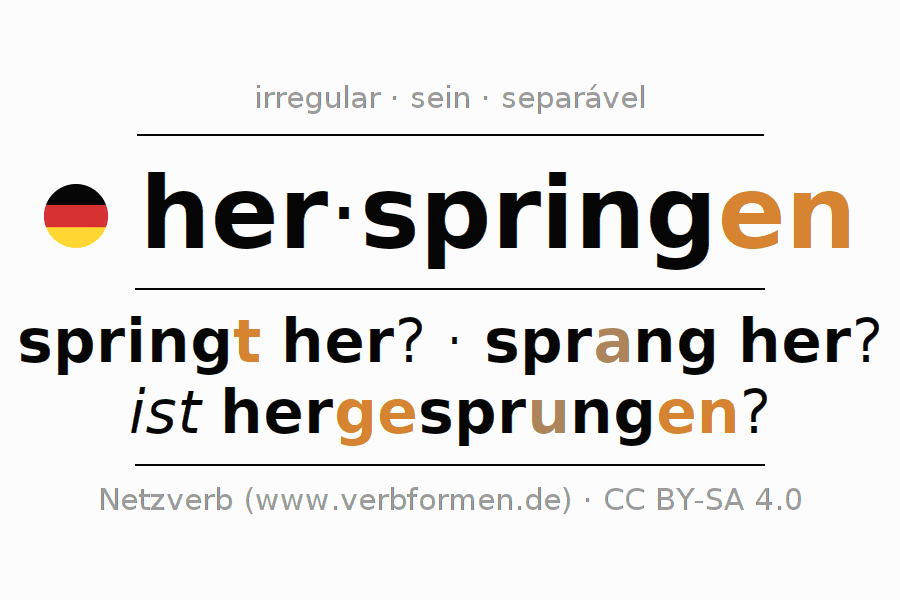 A conjugação do verbo herspringen (pular, pular aqui) é irregular. As formas mais comuns são springt her?, sprang her? e ist hergesprungen?. A apofonia é feita com a vogal do radical i
