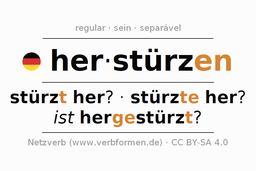 A conjugação do verbo herstürzen (apressar-se, correr) é regular. As formas mais comuns são stürzt her?, stürzte her? e ist hergestürzt?. O verbo auxilar para herstürzen é "sein".