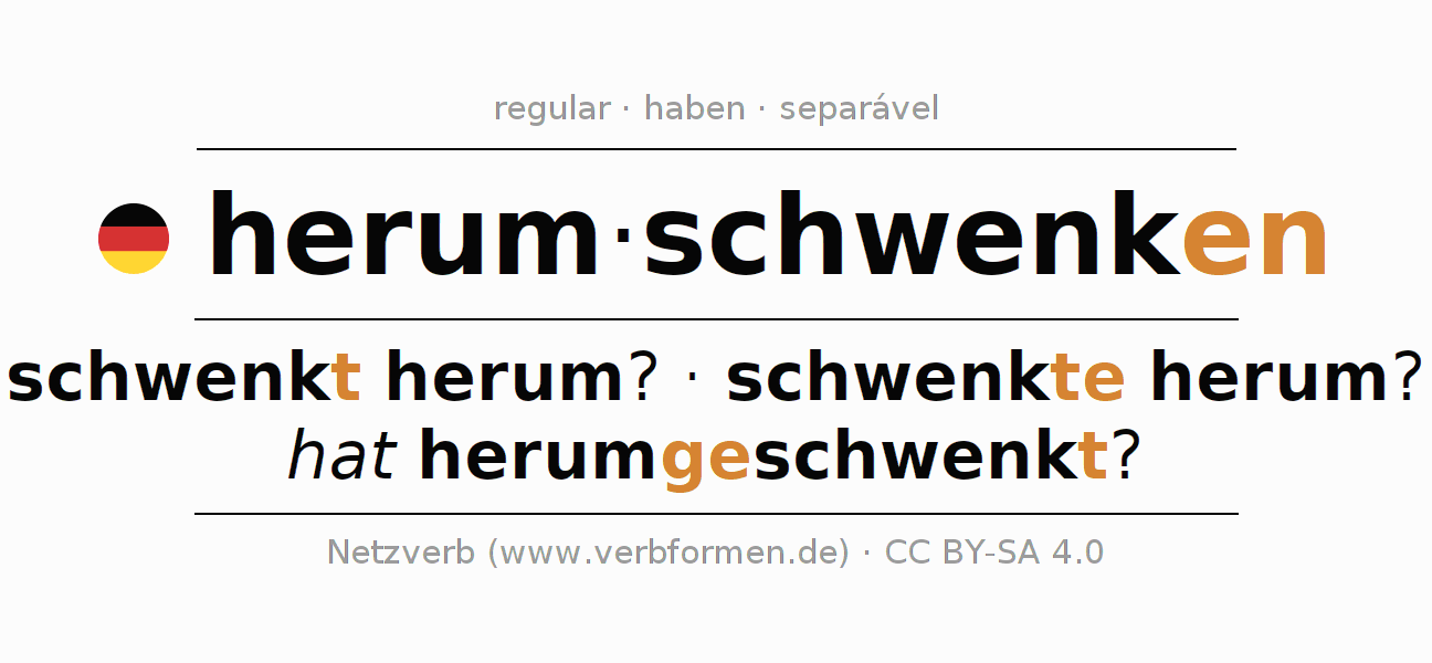 A conjugação do verbo herumschwenken (agitar, balançar) é regular. As formas mais comuns são schwenkt herum?, schwenkte herum? e hat herumgeschwenkt?. O verbo auxilar para herumschwenken é "haben". No entanto, há formas verbais com o verbo auxiliar " sein".