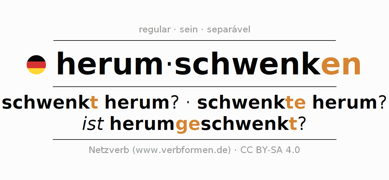 O prefixo herum - de herumschwenken é separável. A flexão ocorre em Ativo e é usada como Oração interrogativa. Para melhor compreensão estão disponíveis incontáveis. Exemplos do verbo herumschwenken . Para a prática e consolidação do estudo