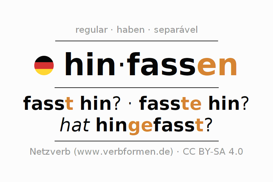 O prefixo hin - de hinfassen é separável. A flexão ocorre em Ativo e é usada como Oração interrogativa. Para melhor compreensão estão disponíveis incontáveis. Exemplos do verbo hinfassen . Para a prática e consolidação do estudo