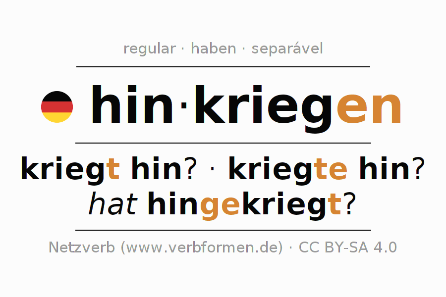 A conjugação do verbo hin·kriegen é apresentada online assim como a Tabela de Verbo com todas as formas verbais no singular e no plural, e em todas as pessoas (1ª pessoa, 2ª pessoa, 3ª pessoa) A flexão do verbo hin·kriegen é portanto, uma ajuda para os trabalhos de casa, testes, exames, aulas de alemão, para o estudo do alemão como língua estrangeira, como segunda língua e também na formação de adultos. Especialmente no aprendizado do alemão é importante a conjugação correta do verbo com as respectivamente formas flexionadas corretamente (kriegt hin? - kriegte hin? - hat hingekriegt?). Mais informações podem ser encontradas no Wiktionary hinkriegen e no Duden hinkriegen.