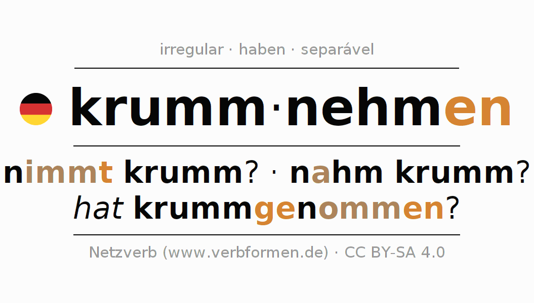 A conjugação do verbo krummnehmen (levar a mal, maltratar) é irregular. As formas mais comuns são nimmt krumm?, nahm krumm? e hat krummgenommen?. A apofonia é feita com a vogal do radical e