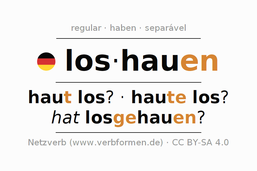 A conjugação do verbo los·hauen é apresentada online assim como a Tabela de Verbo com todas as formas verbais no singular e no plural, e em todas as pessoas (1ª pessoa, 2ª pessoa, 3ª pessoa) A flexão do verbo los·hauen é portanto, uma ajuda para os trabalhos de casa, testes, exames, aulas de alemão, para o estudo do alemão como língua estrangeira, como segunda língua e também na formação de adultos. Especialmente no aprendizado do alemão é importante a conjugação correta do verbo com as respectivamente formas flexionadas corretamente (haut los? - haute los? - hat losgehauen?). Mais informações podem ser encontradas no Wiktionary loshauen e no Duden loshauen.