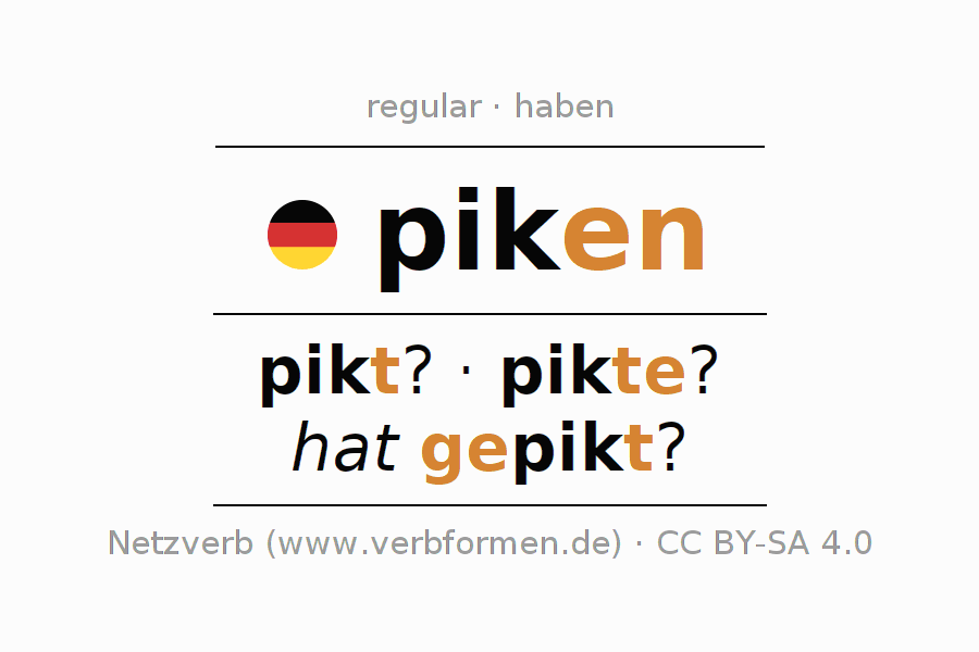 A conjugação do verbo piken é apresentada online assim como a Tabela de Verbo com todas as formas verbais no singular e no plural, e em todas as pessoas (1ª pessoa, 2ª pessoa, 3ª pessoa) A flexão do verbo piken é portanto, uma ajuda para os trabalhos de casa, testes, exames, aulas de alemão, para o estudo do alemão como língua estrangeira, como segunda língua e também na formação de adultos. Especialmente no aprendizado do alemão é importante a conjugação correta do verbo com as respectivamente formas flexionadas corretamente (pikt? - pikte? - hat gepikt?). Mais informações podem ser encontradas no Wiktionary piken e no Duden piken.