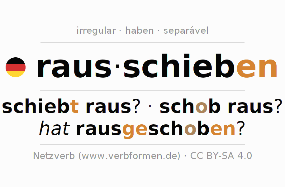 A conjugação do verbo rausschieben (empurrar para fora) é irregular. As formas mais comuns são schiebt raus?, schob raus? e hat rausgeschoben?. A apofonia é feita com a vogal do radical ie