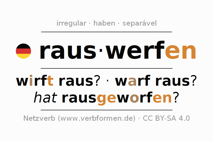 A conjugação do verbo rauswerfen (expelir, remover) é irregular. As formas mais comuns são wirft raus?, warf raus? e hat rausgeworfen?. A apofonia é feita com a vogal do radical e