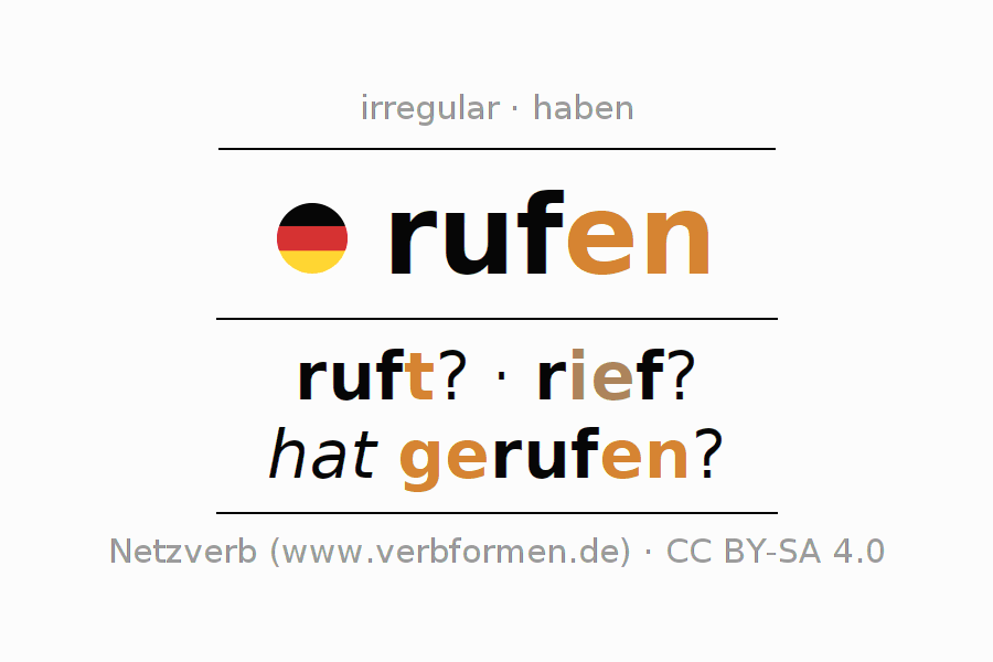A conjugação do verbo rufen (chamar, gritar) é irregular. As formas mais comuns são ruft?, rief? e hat gerufen?. A apofonia é feita com a vogal do radical u