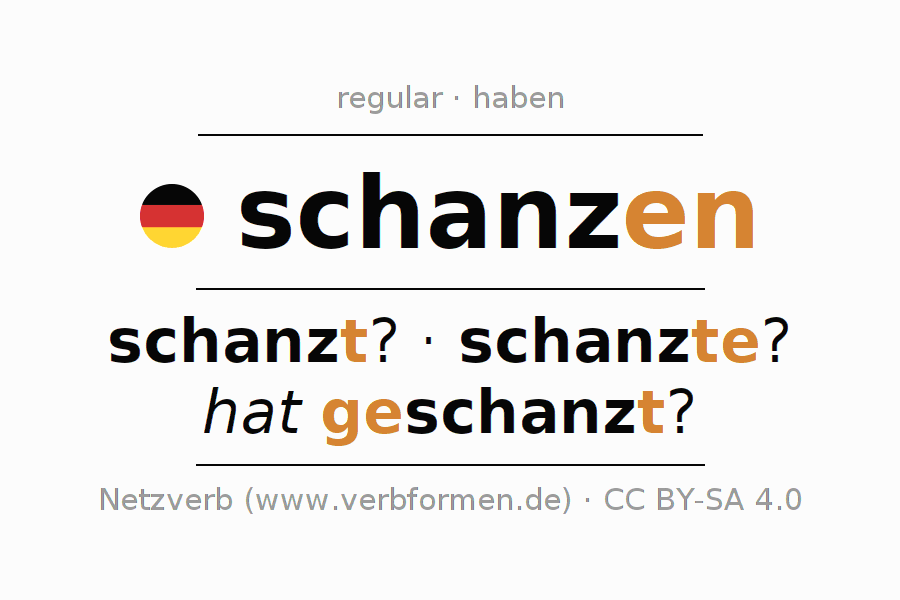 A conjugação do verbo schanzen (barricada, fortificação) é regular. As formas mais comuns são schanzt?, schanzte? e hat geschanzt?. O verbo auxilar para schanzen é "haben".