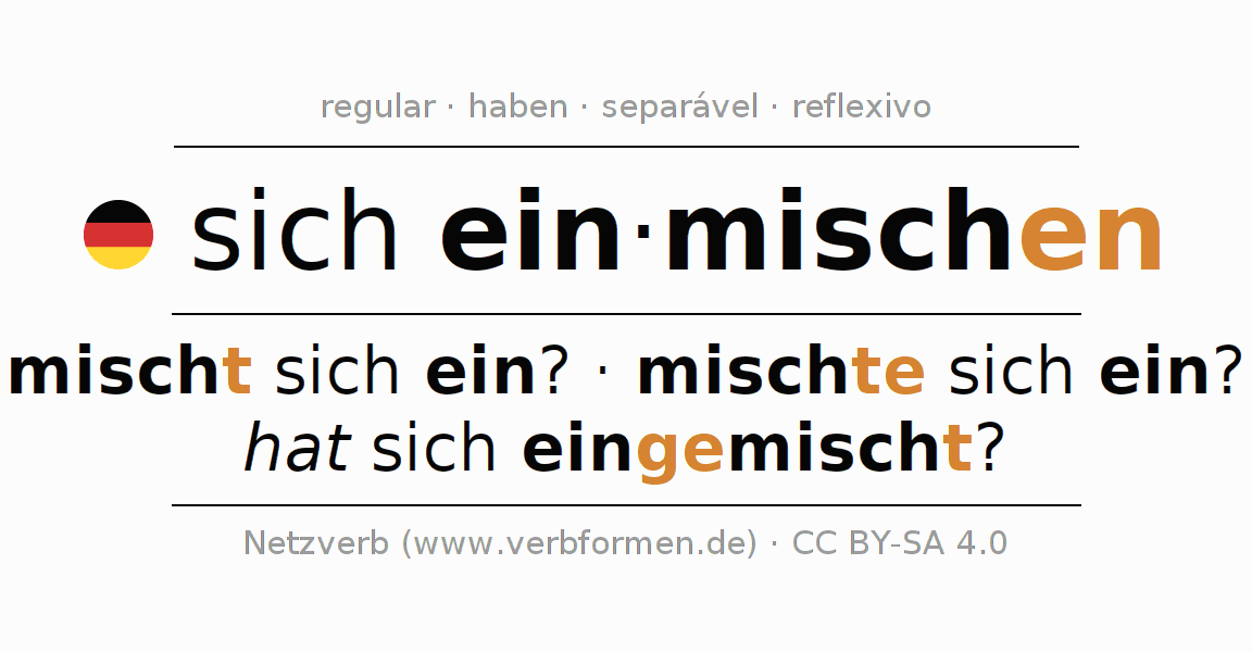 A conjugação do verbo einmischen (interferir, meter-se) é regular. As formas mais comuns são mischt sich ein?, mischte sich ein? e hat sich eingemischt?. O verbo auxilar para sich einmischen é "haben".
