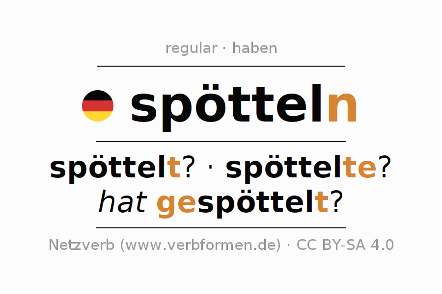 A conjugação do verbo spötteln (ridicularizar, troçar de) é regular. As formas mais comuns são spöttelt?, spöttelte? e hat gespöttelt?. O verbo auxilar para spötteln é "haben".