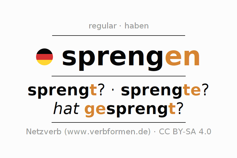 A conjugação do verbo sprengen (explodir, abrir) é regular. As formas mais comuns são sprengt?, sprengte? e hat gesprengt?. O verbo auxilar para sprengen é "haben". No entanto, há formas verbais com o verbo auxiliar " sein".
