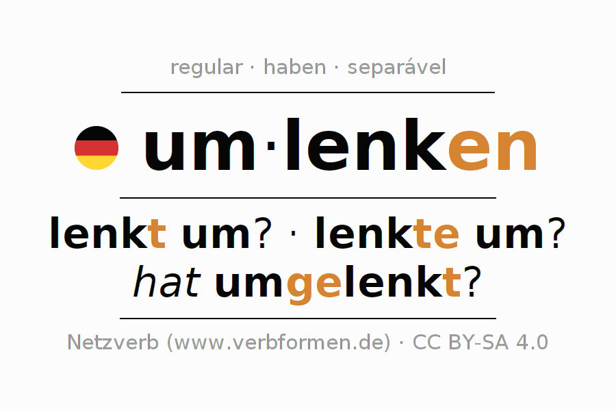 A conjugação do verbo umlenken (desviar, redirecionar) é regular. As formas mais comuns são lenkt um?, lenkte um? e hat umgelenkt?. O verbo auxilar para umlenken é "haben".