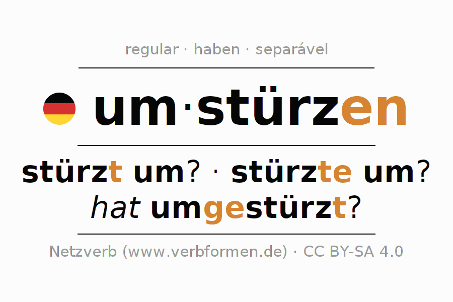 A conjugação do verbo umstürzen (derrubar, virar) é regular. As formas mais comuns são stürzt um?, stürzte um? e hat umgestürzt?. O verbo auxilar para umstürzen é "haben". No entanto, há formas verbais com o verbo auxiliar " sein".