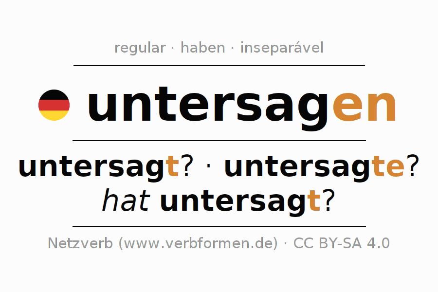 A conjugação do verbo untersagen (proibir, interditar) é regular. As formas mais comuns são untersagt?, untersagte? e hat untersagt?. O verbo auxilar para untersagen é "haben".