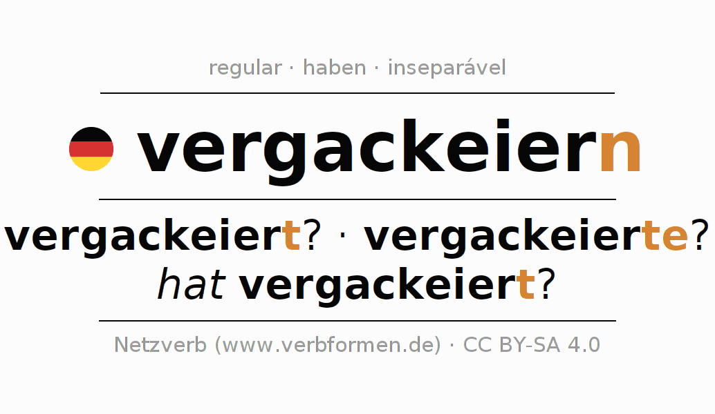 O prefixo ver- de vergackeiern é inseparável. A flexão ocorre em Ativo e é usada como Oração interrogativa. Para melhor compreensão estão disponíveis incontáveis. Exemplos do verbo vergackeiern . Para a prática e consolidação do estudo