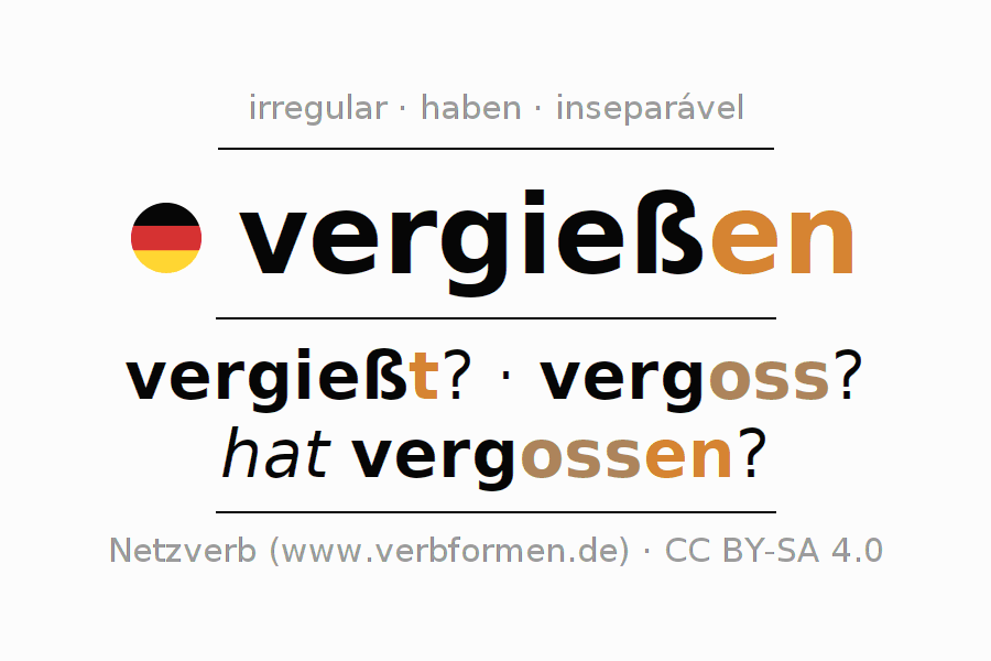O prefixo ver- de vergießen é inseparável. A flexão ocorre em Ativo e é usada como Oração interrogativa. Para melhor compreensão estão disponíveis incontáveis. Exemplos do verbo vergießen . Para a prática e consolidação do estudo