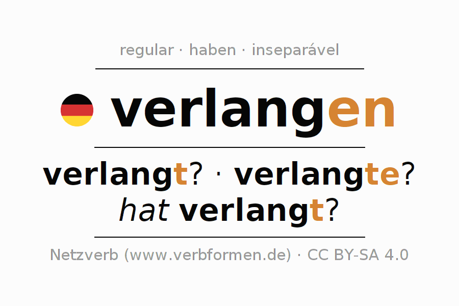 A conjugação do verbo verlangen (exigir, demandar) é regular. As formas mais comuns são verlangt?, verlangte? e hat verlangt?. O verbo auxilar para verlangen é "haben".