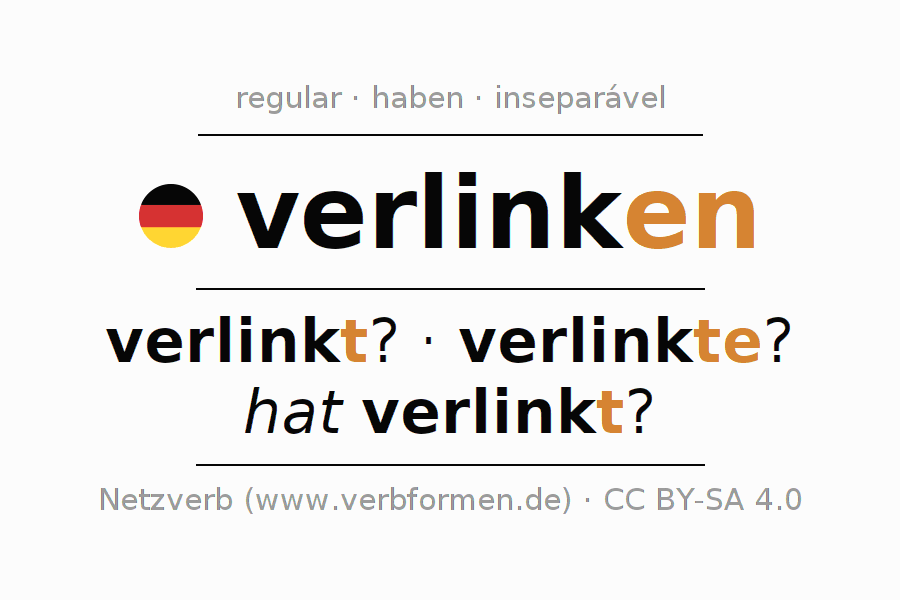 A conjugação do verbo verlinken (criar um link, ligar) é regular. As formas mais comuns são verlinkt?, verlinkte? e hat verlinkt?. O verbo auxilar para verlinken é "haben".