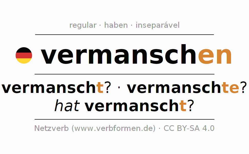 A conjugação do verbo vermanschen é apresentada online assim como a Tabela de Verbo com todas as formas verbais no singular e no plural, e em todas as pessoas (1ª pessoa, 2ª pessoa, 3ª pessoa) A flexão do verbo vermanschen é portanto, uma ajuda para os trabalhos de casa, testes, exames, aulas de alemão, para o estudo do alemão como língua estrangeira, como segunda língua e também na formação de adultos. Especialmente no aprendizado do alemão é importante a conjugação correta do verbo com as respectivamente formas flexionadas corretamente (vermanscht? - vermanschte? - hat vermanscht?). Mais informações podem ser encontradas no Wiktionary vermanschen e no Duden vermanschen.