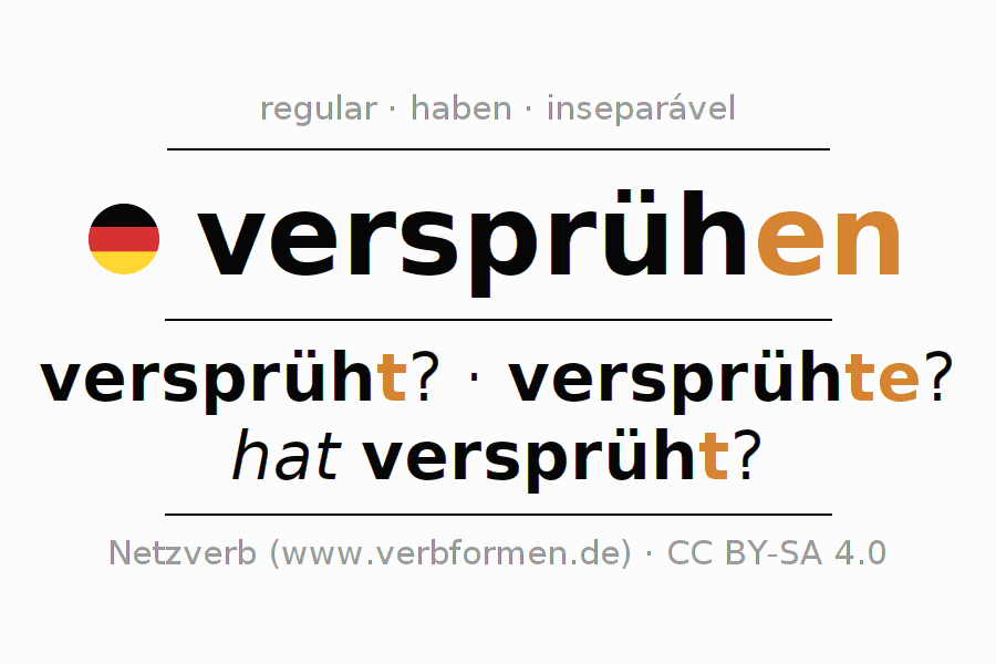 O prefixo ver- de versprühen é inseparável. A flexão ocorre em Ativo e é usada como Oração interrogativa. Para melhor compreensão estão disponíveis incontáveis. Exemplos do verbo versprühen . Para a prática e consolidação do estudo