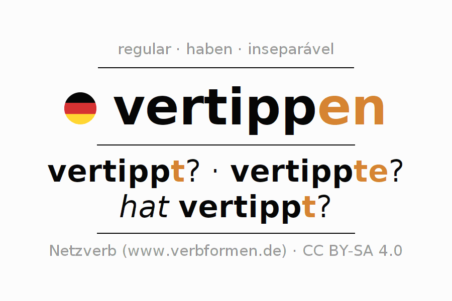 A conjugação do verbo vertippen (digitando errado, digitar mal) é regular. As formas mais comuns são vertippt?, vertippte? e hat vertippt?. O verbo auxilar para vertippen é "haben".