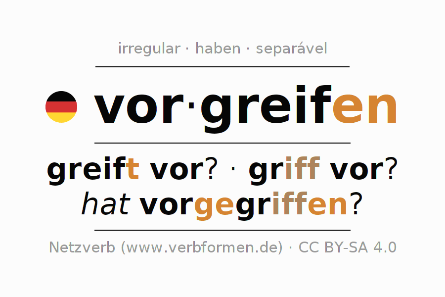 A conjugação do verbo vorgreifen (antecipar, prevenir) é irregular. As formas mais comuns são greift vor?, griff vor? e hat vorgegriffen?. A apofonia é feita com a vogal do radical ei