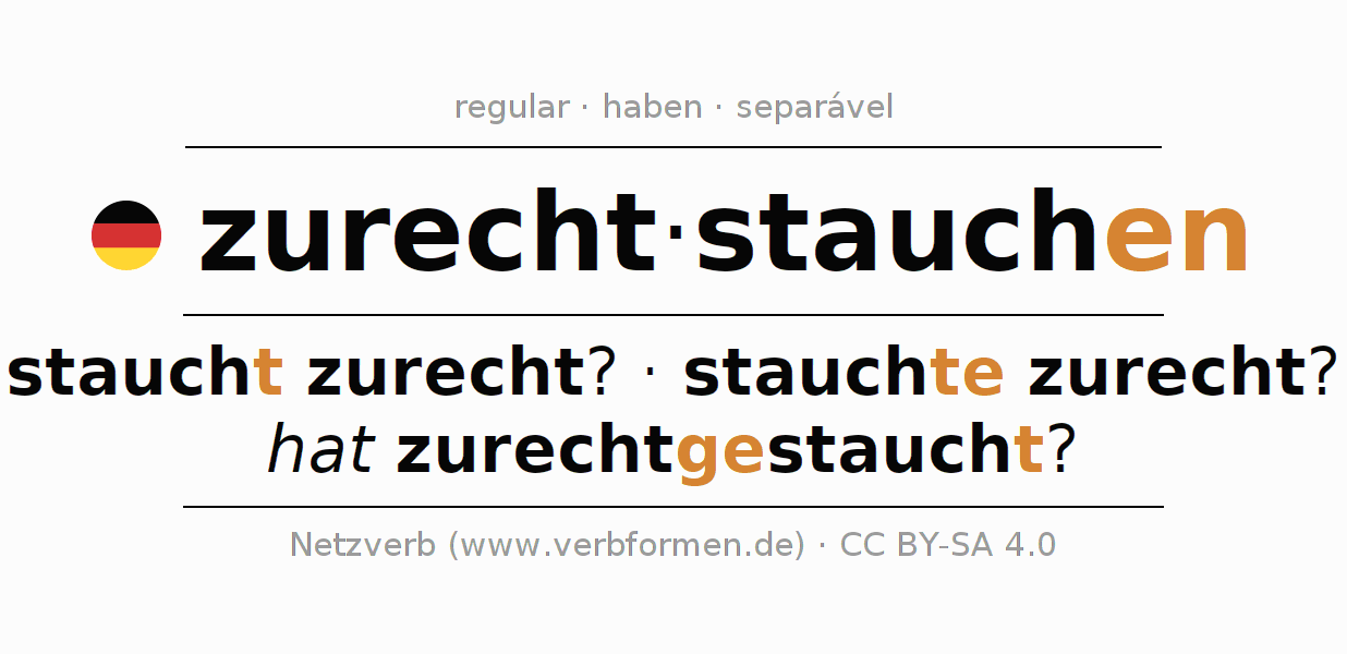 A conjugação do verbo zurechtstauchen (corrigir, repreender) é regular. As formas mais comuns são staucht zurecht?, stauchte zurecht? e hat zurechtgestaucht?. O verbo auxilar para zurechtstauchen é "haben".