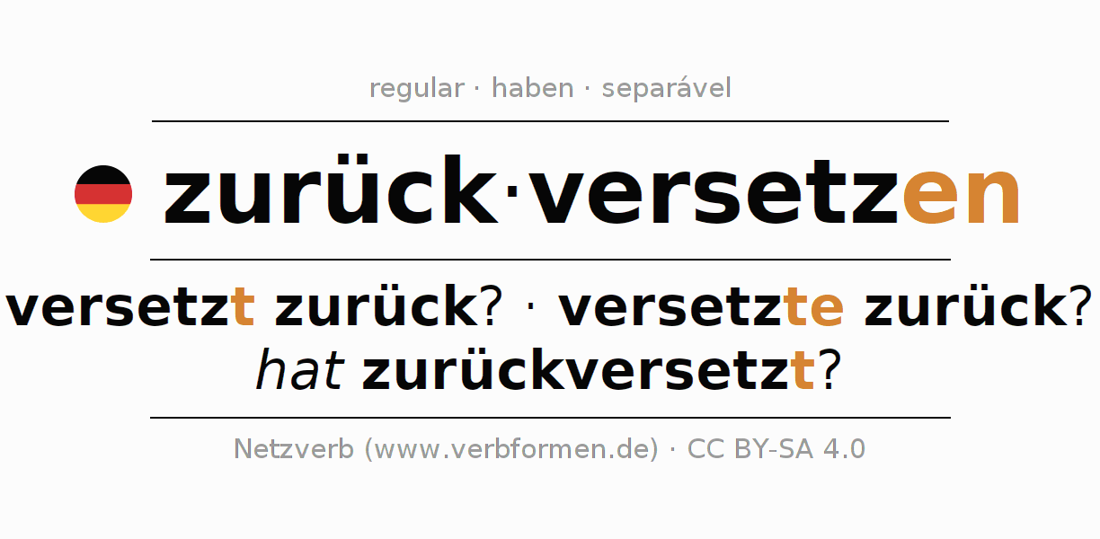 A conjugação do verbo zurückversetzen (transportar, descer) é regular. As formas mais comuns são versetzt zurück?, versetzte zurück? e hat zurückversetzt?. O verbo auxilar para zurückversetzen é "haben".