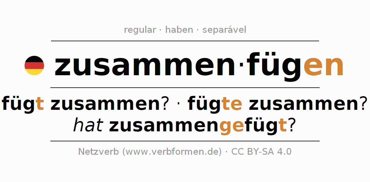 Conjugação simples no presente, pretérito, imperativo e conjuntivo do verbo zusammenfügen