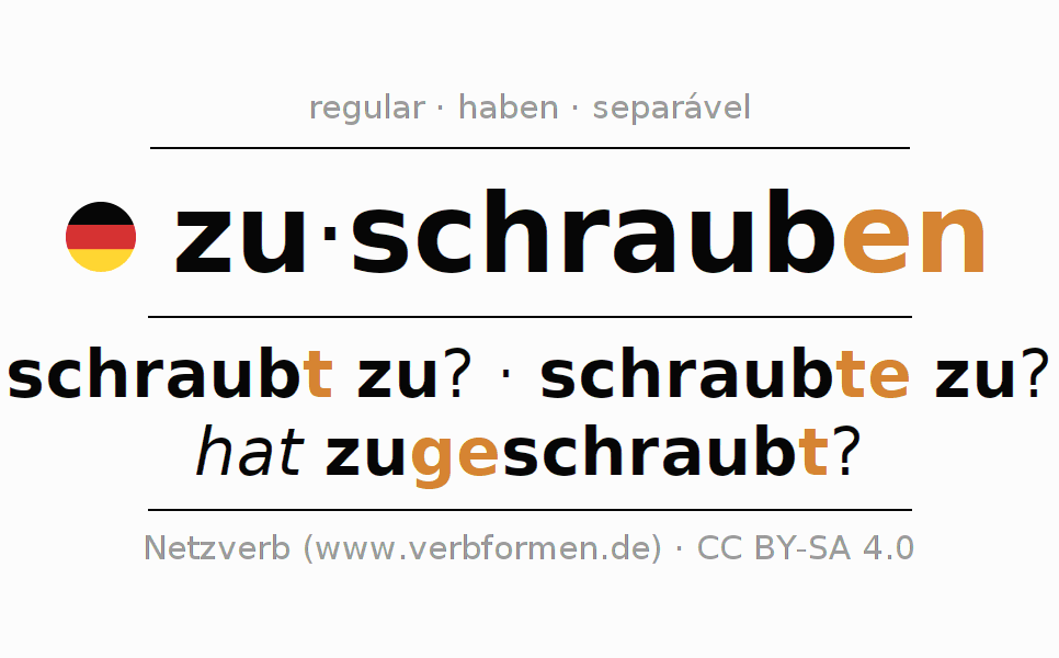 A conjugação do verbo zuschrauben (fechar, aparafusar) é regular. As formas mais comuns são schraubt zu?, schraubte zu? e hat zugeschraubt?. O verbo auxilar para zuschrauben é "haben".