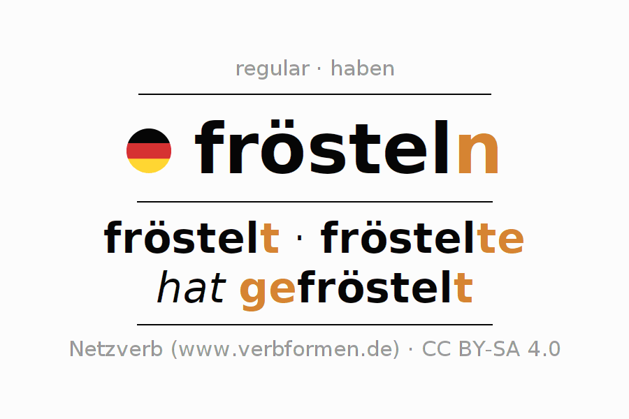 A conjugação do verbo frösteln (frio, arrepio) é regular. As formas mais comuns são fröstelt, fröstelte e hat gefröstelt. O verbo auxilar para frösteln é "haben".