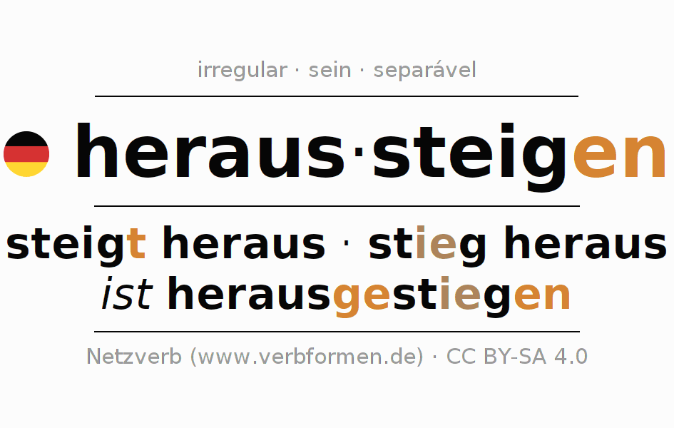 A conjugação do verbo heraussteigen (descer, sair) é irregular. As formas mais comuns são steigt heraus, stieg heraus e ist herausgestiegen. A apofonia é feita com a vogal do radical ei