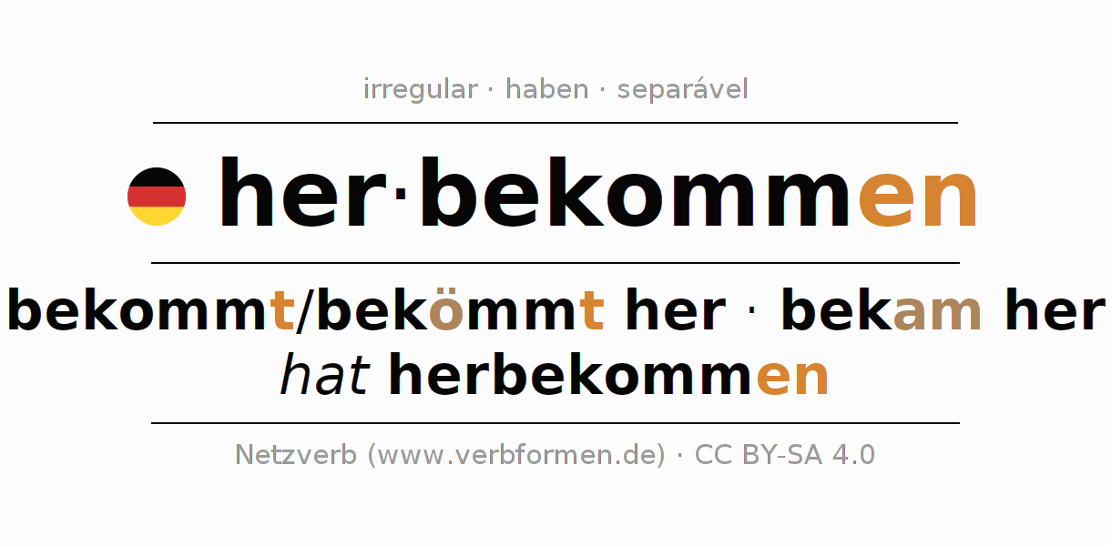 A conjugação do verbo herbekommen (conseguir, arranjar) é irregular. As formas mais comuns são bekommt/bekömmt her, bekam her e hat herbekommen. A apofonia é feita com a vogal do radical o