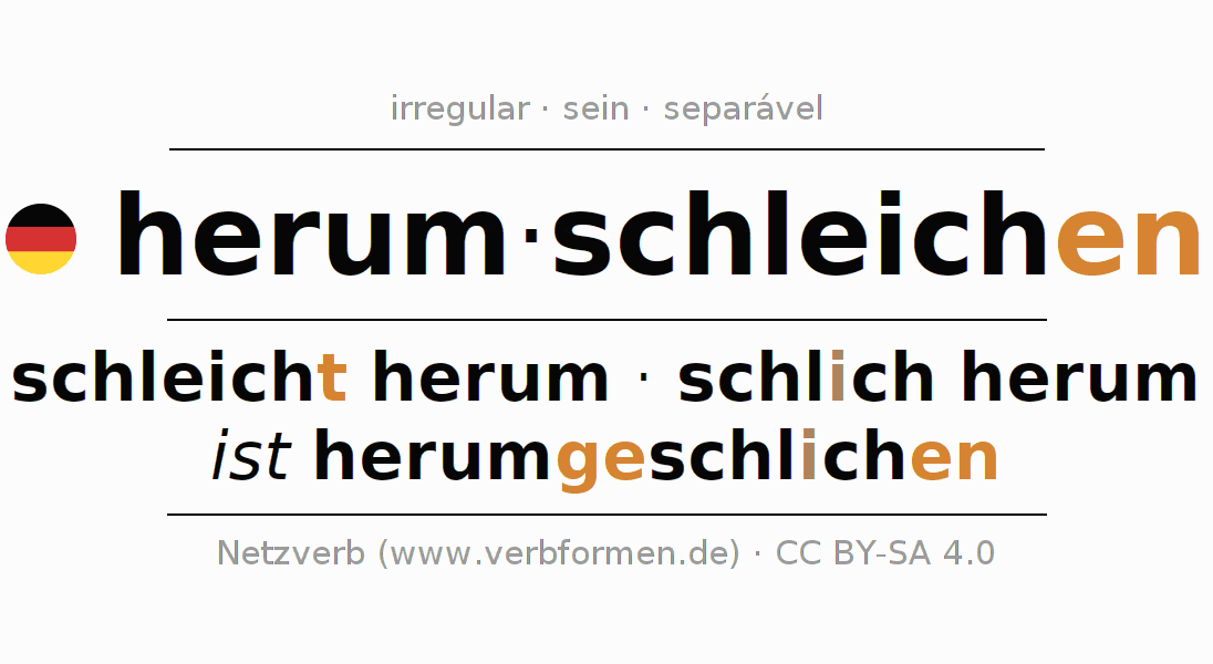 A conjugação do verbo herumschleichen (esgueirar-se, andar furtivamente) é irregular. As formas mais comuns são schleicht herum, schlich herum e ist herumgeschlichen. A apofonia é feita com a vogal do radical ei