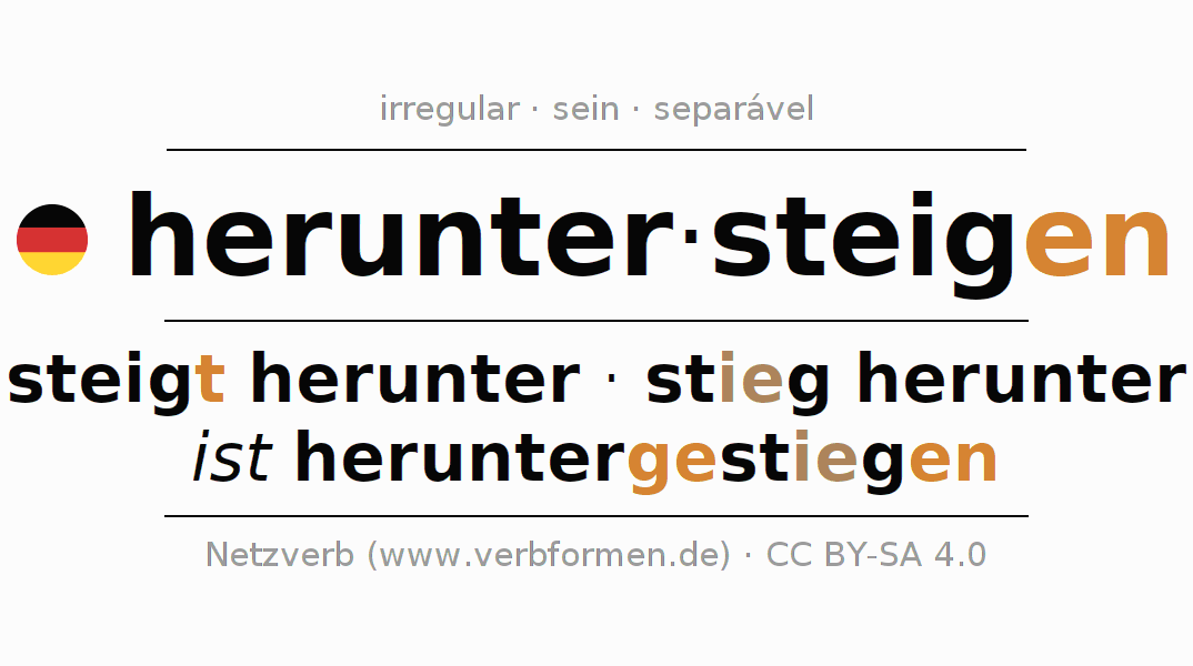 A conjugação do verbo heruntersteigen (descer, descer de) é irregular. As formas mais comuns são steigt herunter, stieg herunter e ist heruntergestiegen. A apofonia é feita com a vogal do radical ei