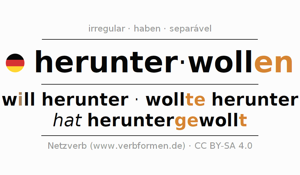 A conjugação do verbo herunterwollen (descer) é irregular. As formas mais comuns são will herunter, wollte herunter e hat heruntergewollt. O verbo auxilar para herunterwollen é "haben".