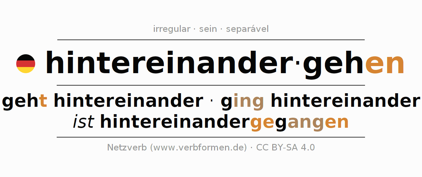 A conjugação do verbo hintereinandergehen (ir em fila) é irregular. As formas mais comuns são geht hintereinander, ging hintereinander e ist hintereinandergegangen. A apofonia é feita com a vogal do radical e