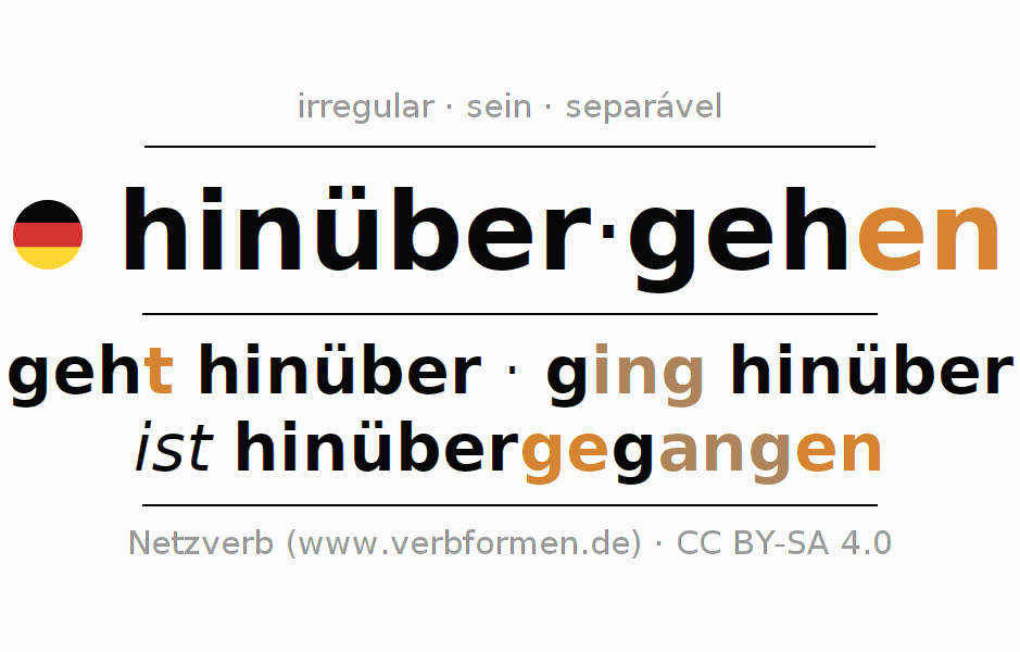 A conjugação do verbo hinübergehen (atravessar, falecer) é irregular. As formas mais comuns são geht hinüber, ging hinüber e ist hinübergegangen. A apofonia é feita com a vogal do radical e