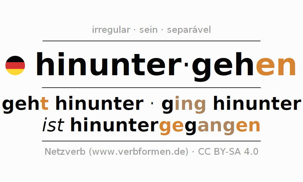 A conjugação do verbo hinuntergehen (descer, ir para baixo) é irregular. As formas mais comuns são geht hinunter, ging hinunter e ist hinuntergegangen. A apofonia é feita com a vogal do radical e