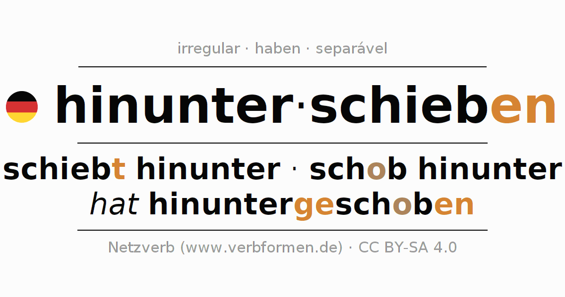 O prefixo hinunter - de hinunterschieben é separável. A flexão ocorre em Ativo e é usada como Oração principal. Para melhor compreensão estão disponíveis incontáveis. Exemplos do verbo hinunterschieben . Para a prática e consolidação do estudo