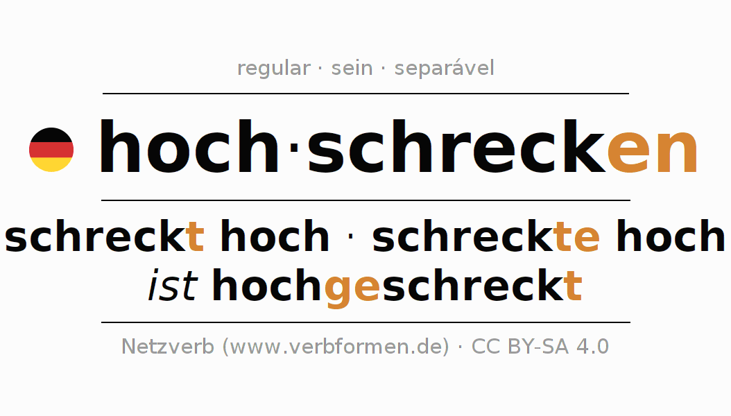 O prefixo hoch - de hochschrecken é separável. A flexão ocorre em Ativo e é usada como Oração principal. Para melhor compreensão estão disponíveis incontáveis. Exemplos do verbo hochschrecken . Para a prática e consolidação do estudo