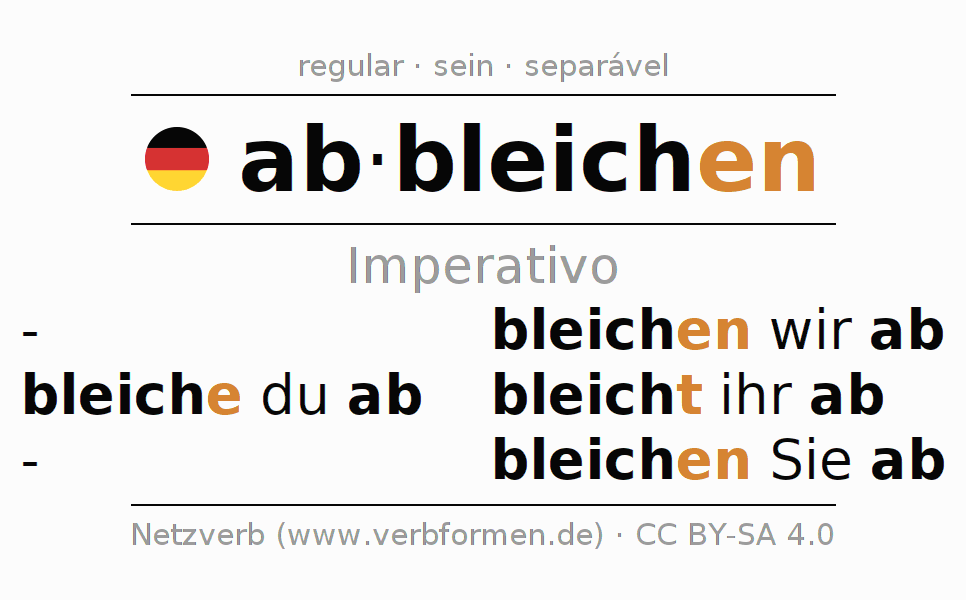 As formas de conjugação do verbo abbleichen (desbotar, esmaecer) no imperativo são: bleiche (du) ab, bleichen wir ab, bleicht (ihr) ab, bleichen Sie ab