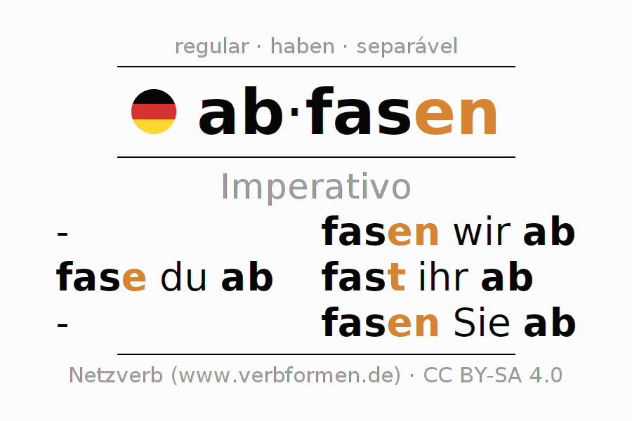 As formas de conjugação do verbo abfasen (chanfrar, bevel) no imperativo são: fase (du) ab, fasen wir ab, fast (ihr) ab, fasen Sie ab