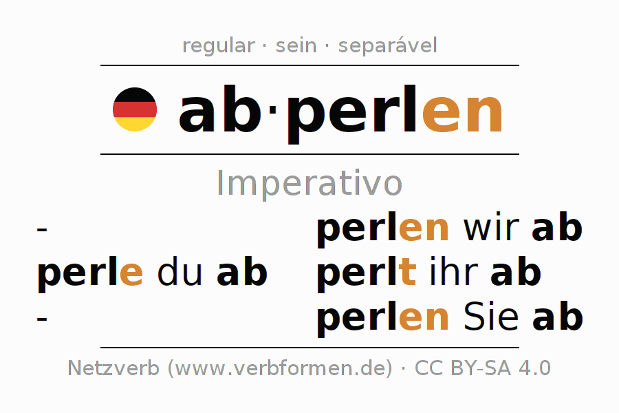 As formas de conjugação do verbo abperlen (beruhigen, escorregar) no imperativo são: perle (du) ab, perlen wir ab, perlt (ihr) ab, perlen Sie ab