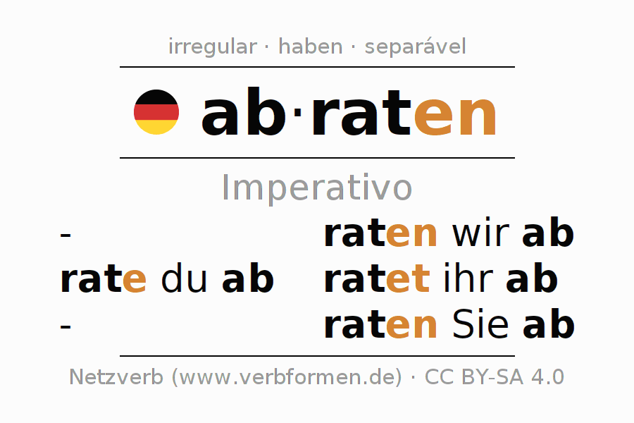 As formas de conjugação do verbo abraten (desaconselhar, desaconselhar a) no imperativo são: rate (du) ab, raten wir ab, ratet (ihr) ab, raten Sie ab