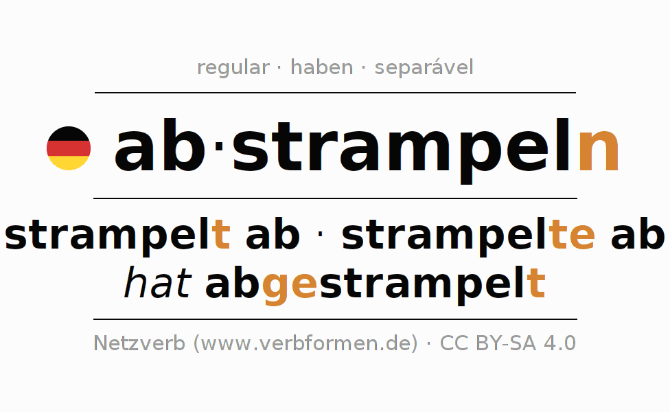 As formas de conjugação do verbo abstrampeln (pedalar intensamente) no imperativo são: stramp(e)le (du) ab, strampeln wir ab, strampelt (ihr) ab, strampeln Sie ab