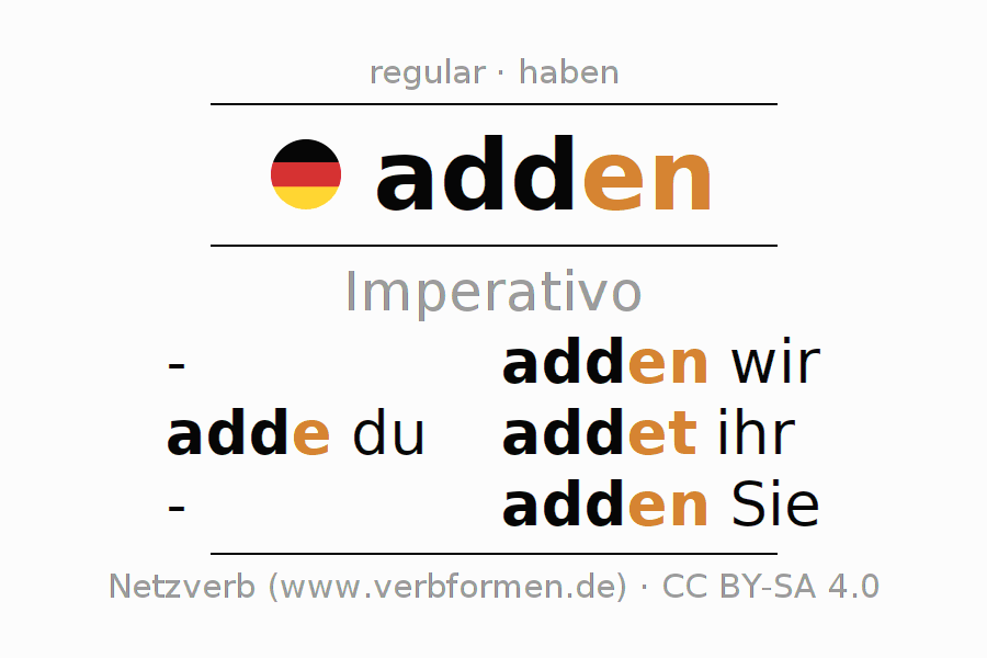 As formas de conjugação do verbo adden (adicionar) no imperativo são: adde (du), adden wir, addet (ihr), adden Sie