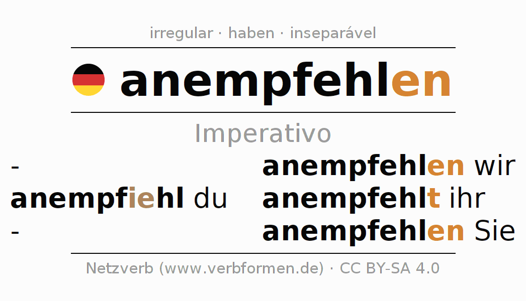 As formas de conjugação do verbo anempfehlen (recomendar) no imperativo são: anempfiehl (du), anempfehlen wir, anempfehlt (ihr), anempfehlen Sie
